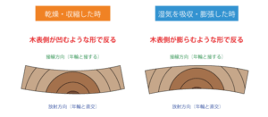 ・木材は湿気や温度に敏感で、乾燥すると縮み、湿気ると膨らむ